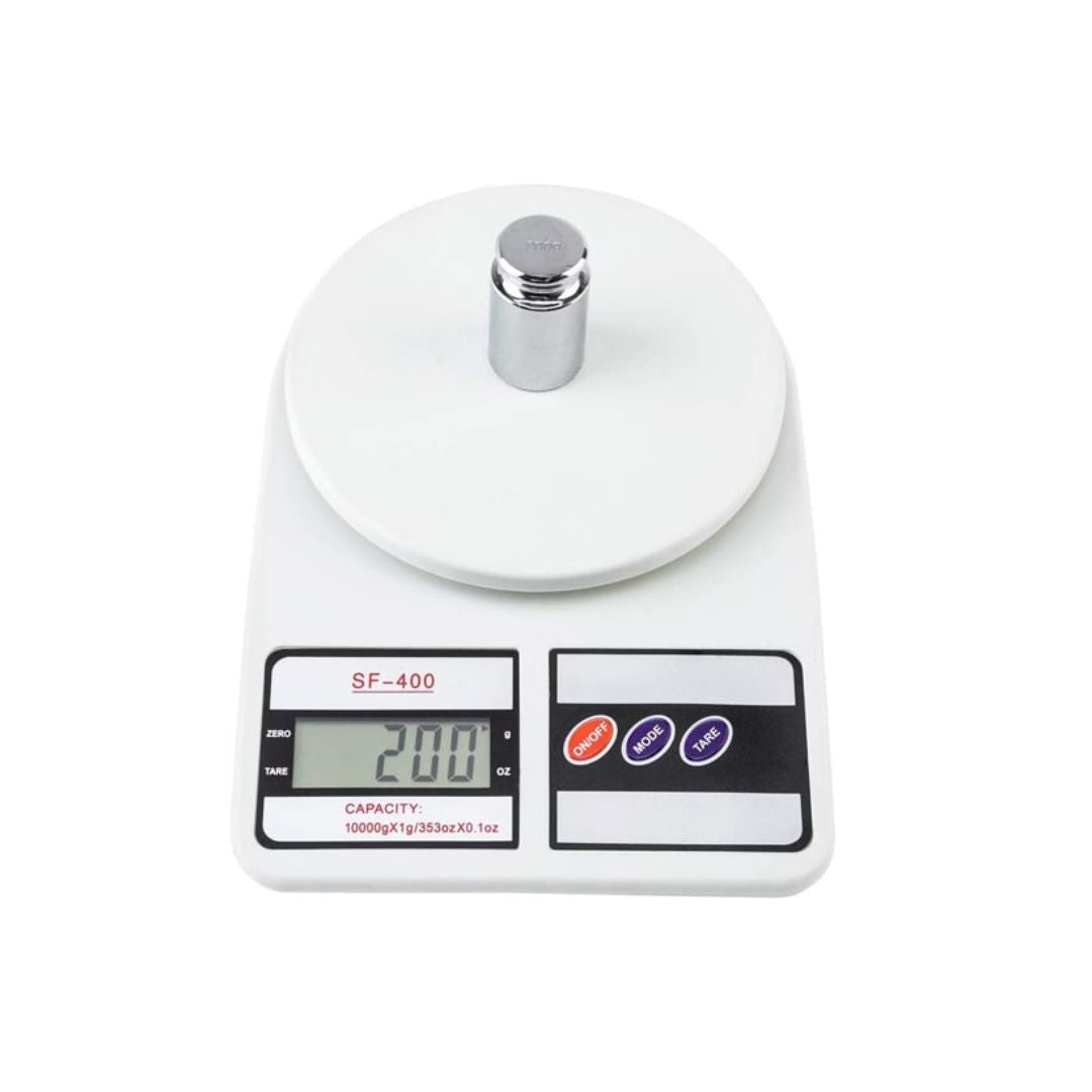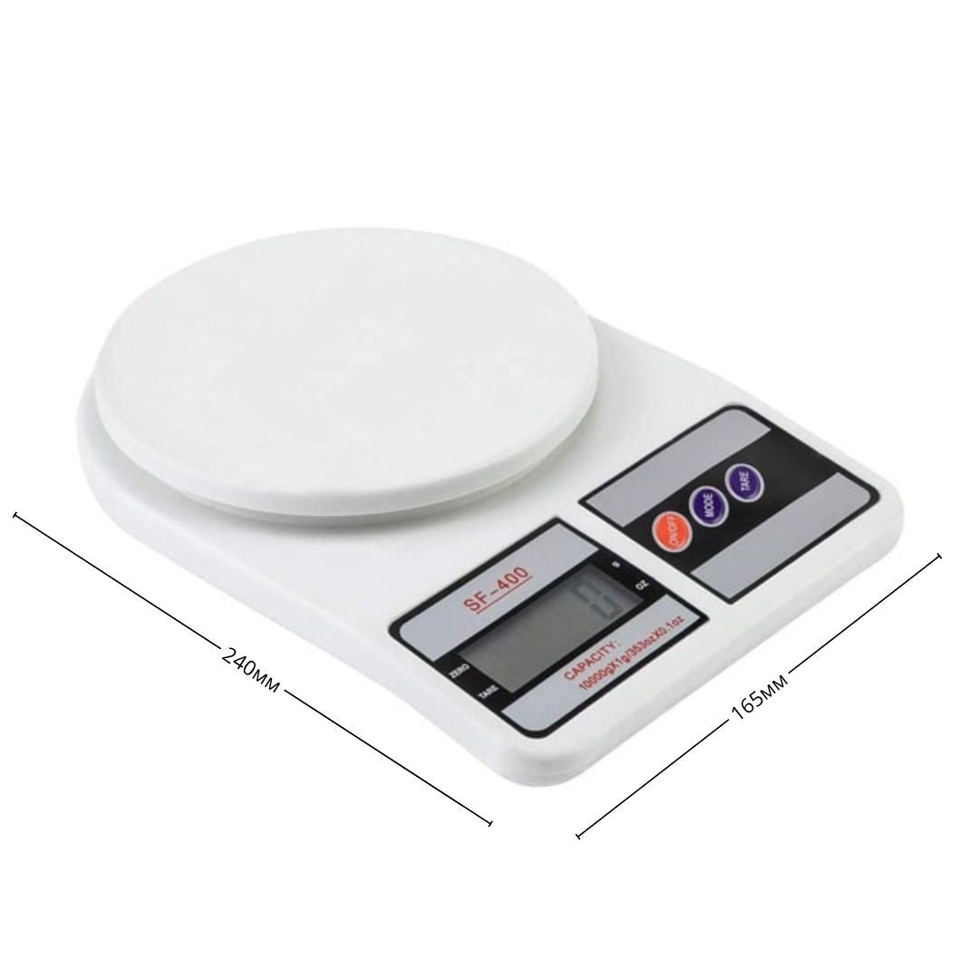 Дигитална, бяла, кухненска везна с LCD дисплей, 2 батерии в комплекта, TARE функция, Mаксимум 10 кг. Електронната везна работи на батерии и разполага с възможност за измерване в различни мерни единици. Функцията TARE позволява да сложим върху плота на везната съд и след като натиснете копчето TARE, тогава тази функция изчиства теглото на сложения съд и в този съд, вие може многократно да слагате различни неща