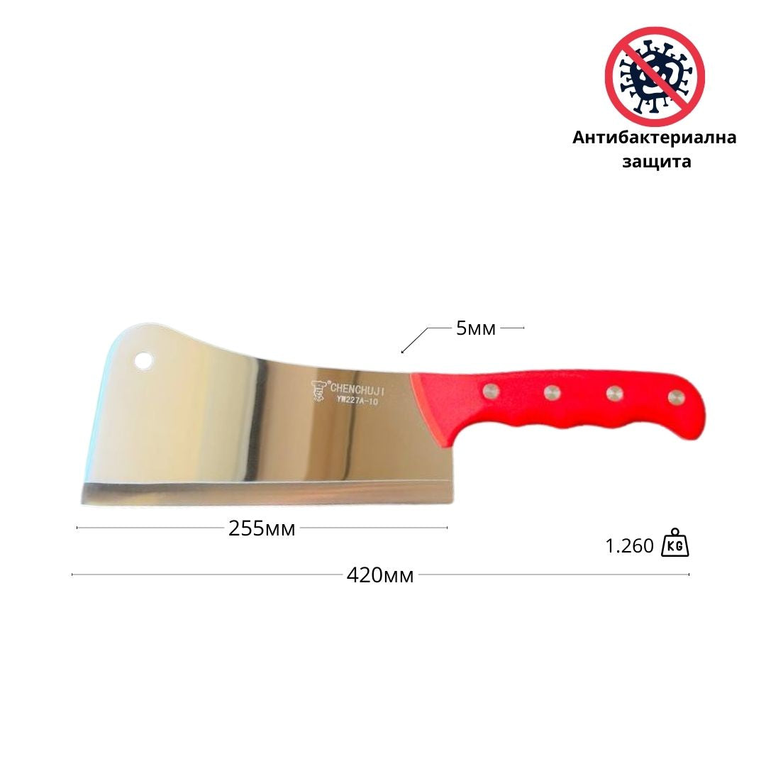 Професионален сатър за сечене на месо и кости. С eргономична, антибактериална дръжка, устойчива на хлъзгане дръжка, захваната с четири нита към стоманата.